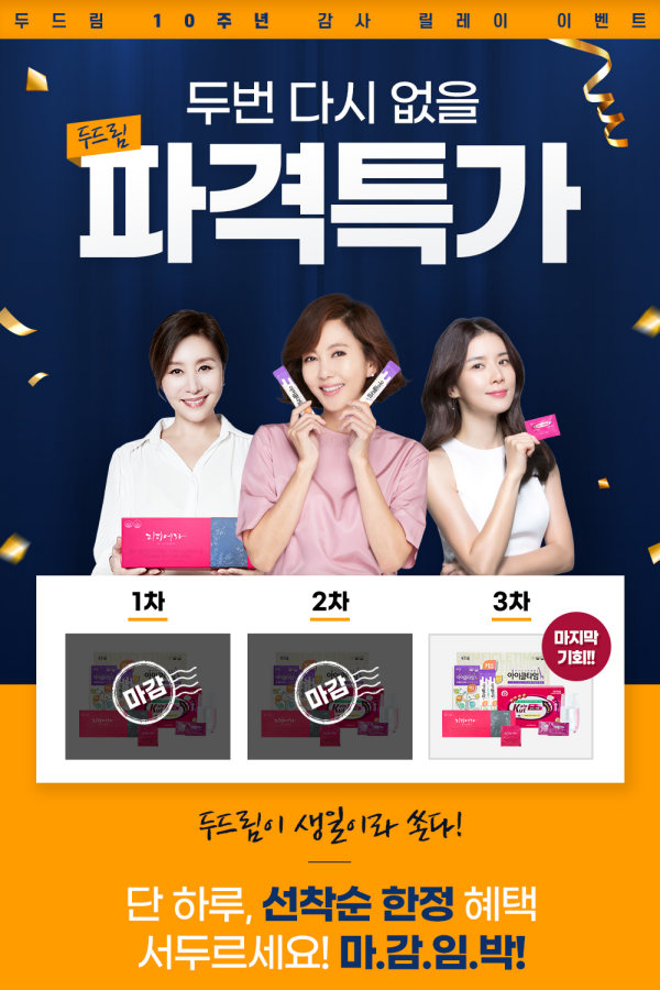 한편, 두드림 10주년 파격특가 이벤트는 1차, 2차가 높은 관심으로 조기 종료되었으며 마지막 3차 이벤트를 진행하고 있다.